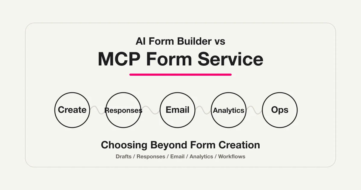 An AI form builder helps you create forms faster. An MCP form service connects AI clients to the real form system so they can help with responses, emails, analytics, workflows, and post-publish operations.