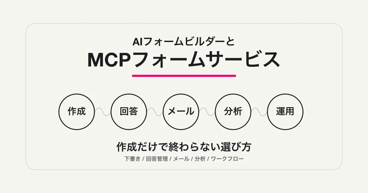 この記事では、この2つの違いを、検索してきた方がそのまま判断できるように整理します。先に結論を言うと、単発のアンケートや簡単な受付ならAIフォーム作成だけで十分な場面があります。一方で、問い合わせ、採用、イベント、資料請求のように回答後の対応が続くフォームでは、MCPで公開後の運用まで扱えるかが重要になります。