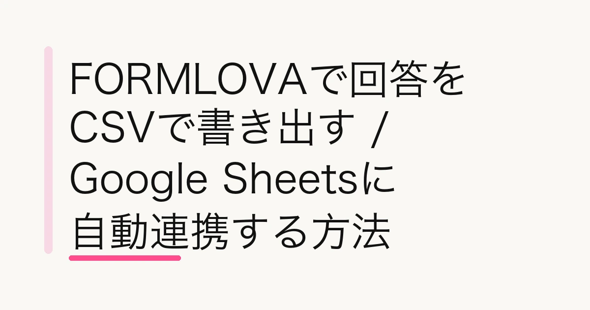 フォームを公開したあと、次に考えるのは回答データをどこで見るかです。まず手元に持ち出したいなら CSV が早いですし、継続的に表で追いたいなら Google Sheets の自動連携が向いています。FORMLOVA では、この2つを同じ会話の流れで扱えます。今回は、実際に CSVで書き出して と頼んだ例と、Google Sheets 連携したい と頼んだ例を並べながら、一度持ち出す と 自動で同期する の違いがわかる形で見ていきます。